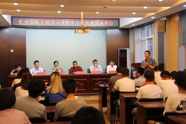 2018年5月31日下午beat365平台唯一官网在虎峪校区采矿楼二层学术厅举办了“学习贯彻落实民族政策座谈会”。校学生处专项工作负责人张晓梅、内派教师刘文振、库尔班江·尼亚孜、杨雷等老师应邀出席会议;院党委书记薛武杰、副书记武佐君、院团委书记田韶华、副书记刘安、民族工作专项负责人洪俊、全体辅导员及学院少数民族学生代表60余名参加了此次座谈会,会议由副书记武佐君主持。