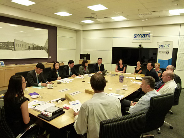 澳大利亚卧龙岗大学建于1951年,是一所以工程、科技、商学为主的综合性大学,其信息技术、计算机科学、工程学科领域位于澳洲前列。12月9日上午,我校代表团与卧龙岗大学国际事务副校长Joe Chicharo教授、研究与创新执行副校长Tim Marchant教授、工程与信息科学学院院长Chris Cook教授、矿业工程学科Ting Ren教授、国际教育联合中心主任Bill Damachis博士等进行了交流。吕明校长与Chicharo副校长签署了校际合作备忘录。之后,研究与创新执行副校长Tim Marchant教授、工程与信息科学学院院长Chris Cook教授、矿业工程学科Ting Ren教授、国际教育联合中心主任Bill Damachis博士等与代表团就采矿工程专业本科生联合培养、研究生互派、教师互访等问题进行了交流。梁卫国院长还与Ting Ren教授就联合推进并共同举办2016年国际绿色采矿会议进行了商谈。