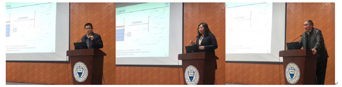 报告中,王磊同学指出,我国油页岩储量巨大,其高效热解形成的页岩油对于缓解我国目前石油紧张局势具有重要的意义。传统的化石燃料开采方式主要依靠地下井工开采,但该方法成本较高,并且容易导致地表大范围沉陷。他介绍了我校赵阳升团队提出的“对流加热开采油页岩技术”,该技术旨在原位状态下注入过热蒸气实现页岩油的开采,对注水蒸气原位热解油页岩模拟试验后矿体内部的微细观特征进行了系统分析,并介绍注水蒸汽热解油页岩开采油气的提质试验和作用机理。